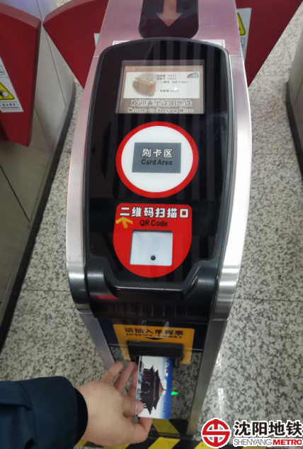 2.持单程票的乘客,请右手持票,将车票插入单程票回收口。使用储值票或手机NFC虚拟卡的乘客,请将储值票或手机NFC线圈位置置于屏幕刷卡区域。
